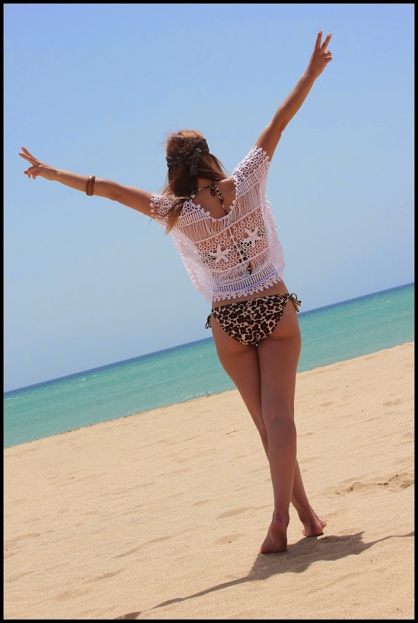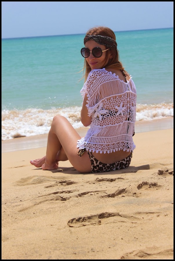Este top crochet de Stradivarius lo conseguí en rebajas online del año pasado y no puedo estar más contenta con él ya que es ideal para las vacaciones en la playa o en la piscina y dar así un toque boho chic a tu atuendo de verano. En esta ocasión lo he combinado con shorts vaqueros y sobre un bikini de estampado leopardo adquirido en Blanco hace dos temporadas pero que aún me chifla.