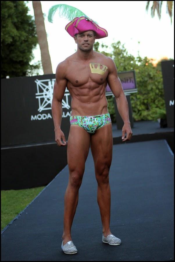 Ebed Mata de Model´s luce un bañador con motivos florales que nos hace imaginar la belleza y colorido de los Jardines de Versalles adornado en los laterales con calado canario en el mismo tono verde. El calzado es de la firma Paez.