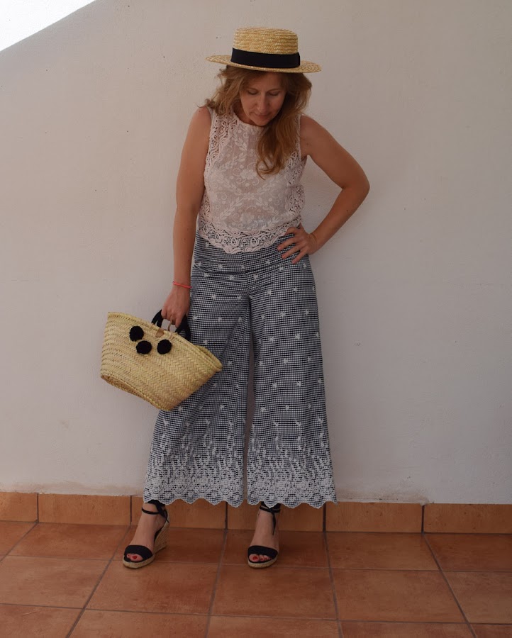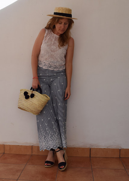 Para completar, complementos que me han acompañado todo el verano: alpargatas de cuña, capazo customizado y canotier, en un día que no hacía viento.