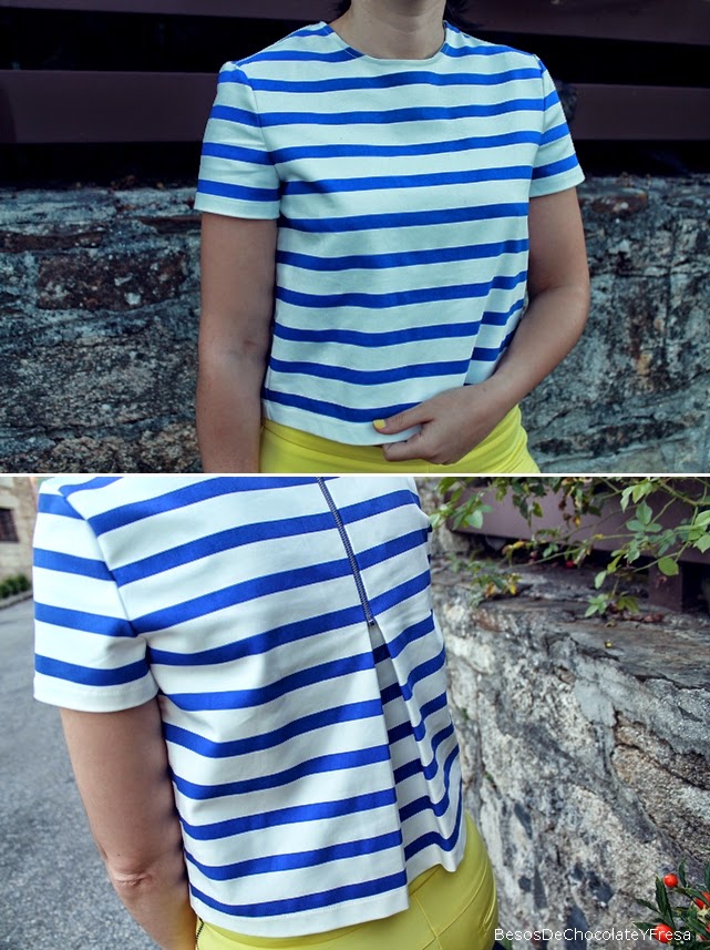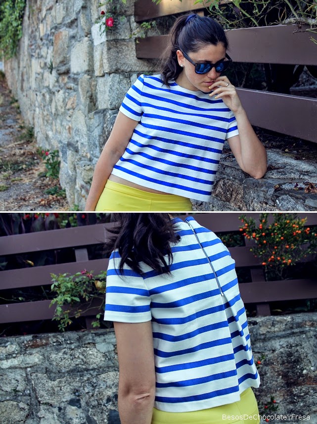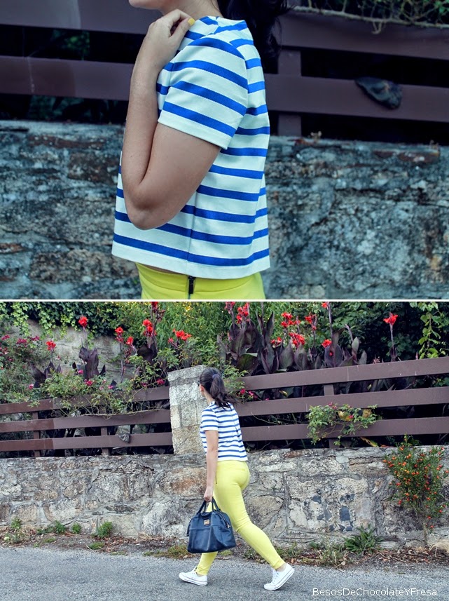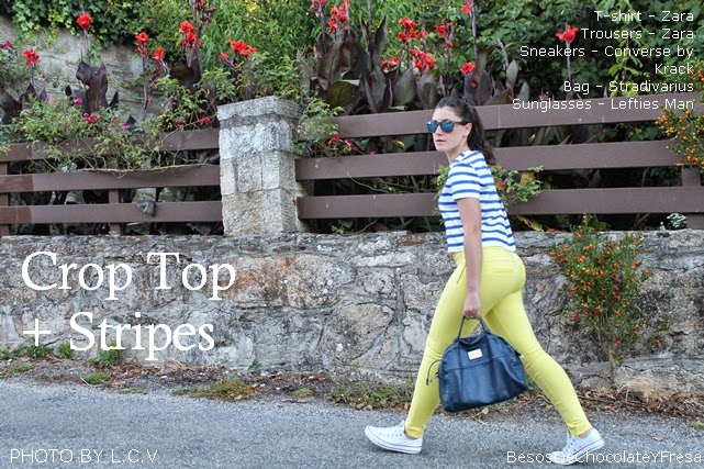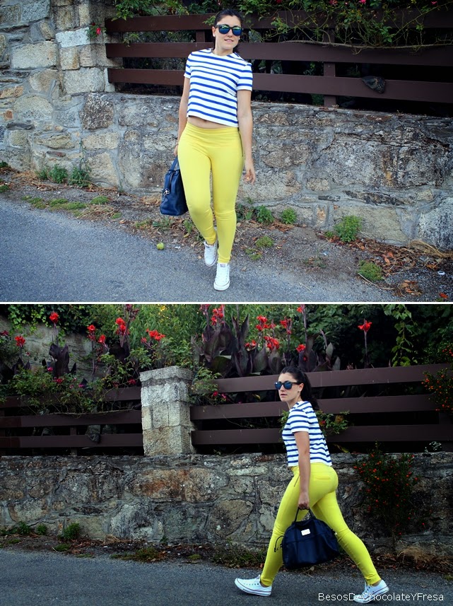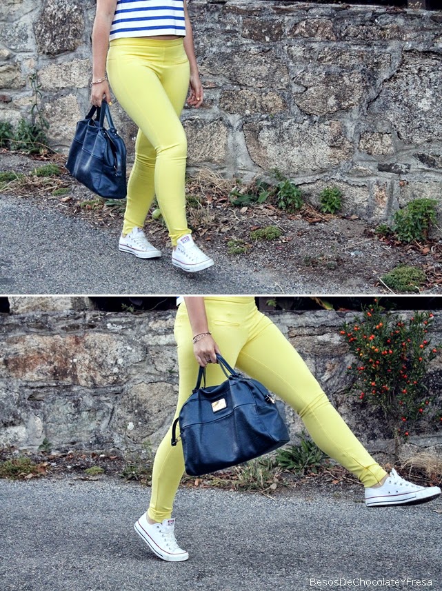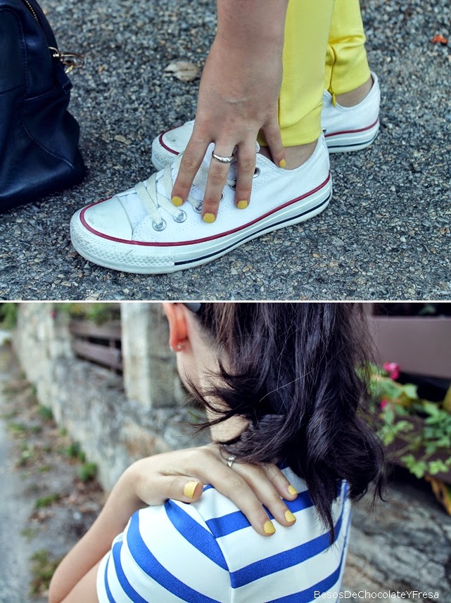 Para esta ocasión llevo pantalones amarillos a juego con la manicura, con mi nueva crop top de rayas marineras, una más para la colección jeje, bolso bandolera azul marino y para ir cómoda, converse en blanco.