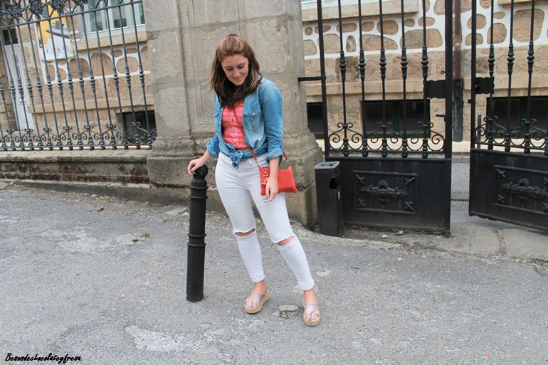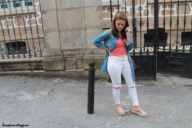 En el look de hoy os traigo un top, "crop top" en tonos coral y azul con detalle de botones en la parte delantera, panel de abeja en la parte trasera y tirantes. Lo combiné con pantalones blancos de tiro algo que es como mejor sientan este tipo de tops, sandalias de brillos, sobrecamisa denim, atada o suelta, apta para llevar de ambas maneras y bolso del mismo tono coral.