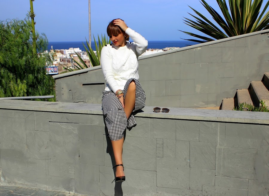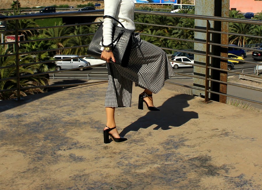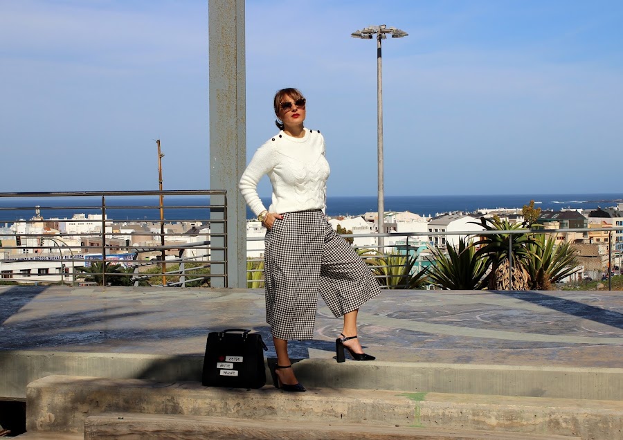 Hola chic@s!! comenzamos la semana con un look cómodo con pantalón cropped que ha sido y es la prenda estrella de la temporada. La peculiaridad de este modelo está en que de frente parece una falda cruzada y me recuerdan a las faldas´pantalón que me obligaba mi madre a ponerme jajaja...ahora me hubiera encantado. Su estampado es el clásico cuadro vichy en bicolor negro y blanco, super fácil para combinar con cualquier color y estampado.