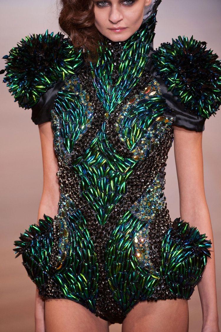 Uno de los grandes vestidos que aparece en la película hace referencia a la técnica de usar alas de escarabajos asiáticos como aplicaciones.One of the main dresses that appear in the movie is clearly inspired by Mcqueen’s creations. It also refers to a special technique using Asian beetle wings as applications. Simply wonderful