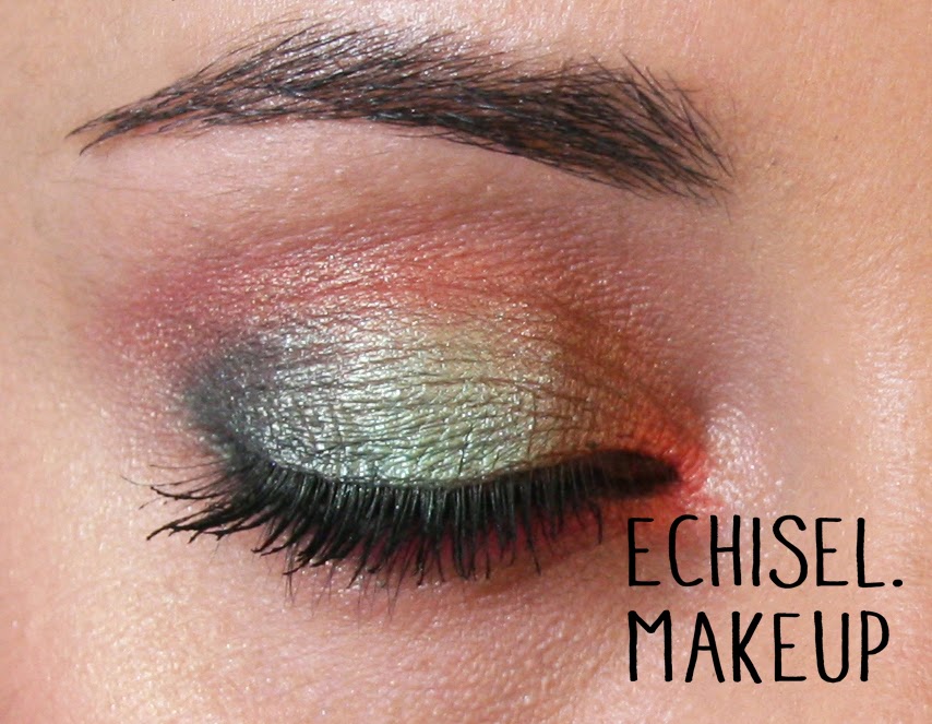 Para los ojos hice una mezcla de varias marcas y tonos. Desde hace tiempo me apetecía mezclar en un mismo look el color verde y el naranja. Y aunque parezca que de esa unión no puede salir nada ponible, aquí veis que cualquier color se puede mezclar con otro por raro que pueda parecer, sólo hay que estudiar cómo hacerlo.