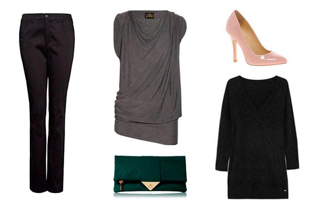 No uses cuellos tipo Tortuga. Prendas clave: Pantalones o Jeans con una ligera campana o rectos, blusas drapeadas, zapatos cerrados en punta y accesorios discretos