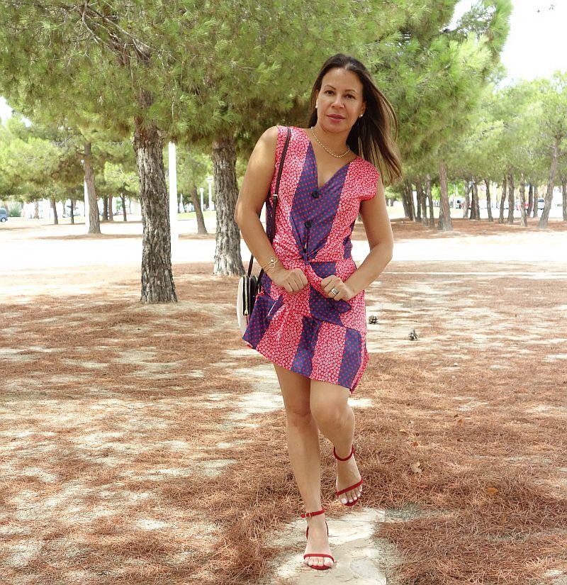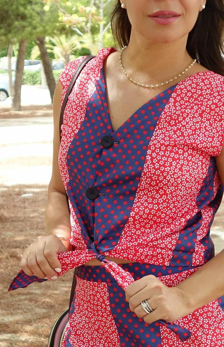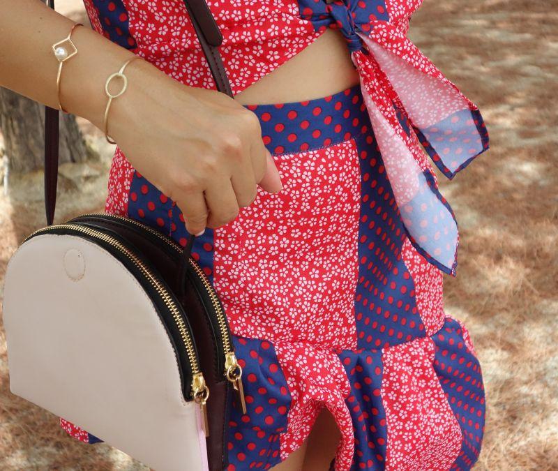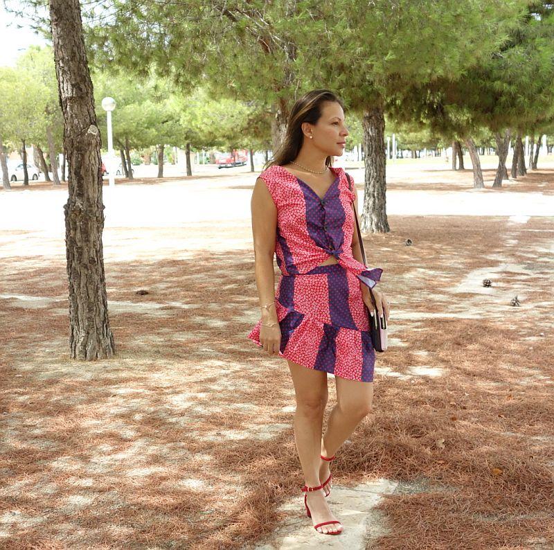 El conjunto con una tendencia llamada Matchy, usada para vestir igual a otro (también llamada twinning) o llevar un conjunto con el mismo estampado (algo ya que se había dejado de ver un poco), lo he combinado con zapatos rojos y un minibolso en beige, y para no recargarlo, ya que es un estampado algo llamativo, no llevé más que una cadena y pulseras sencillas que hacen juego con este.