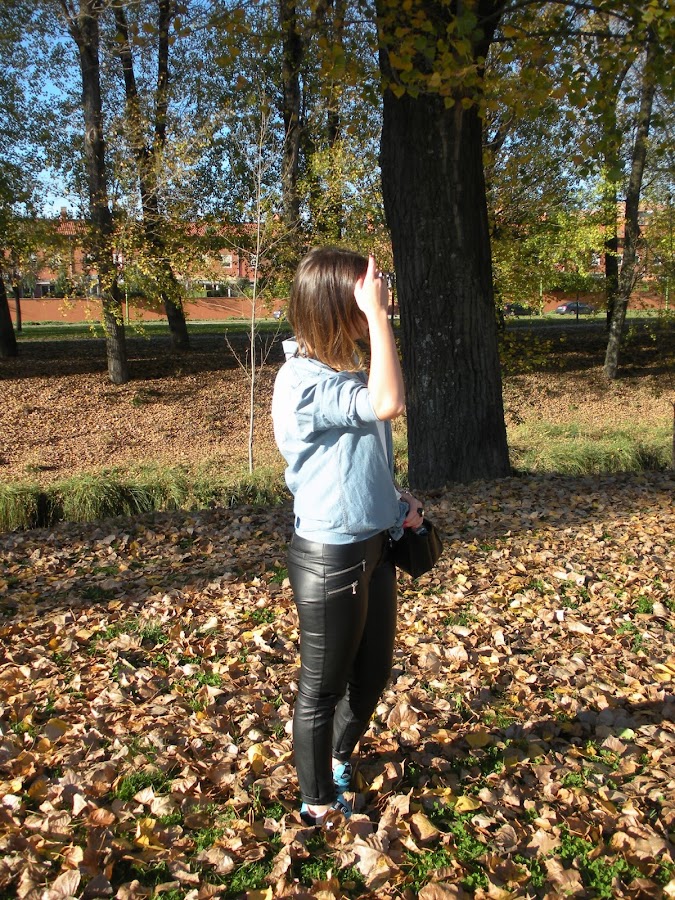 Una camisa vaquera, camiseta básica blanca, pantalón de cuero y sneakers y lista para ir a IKEA.