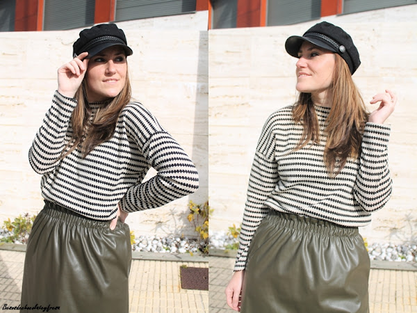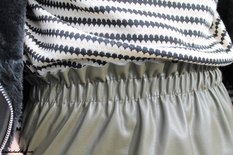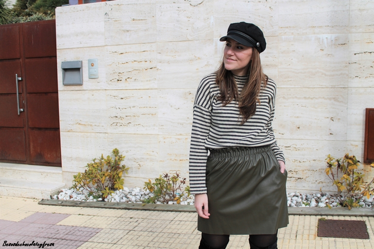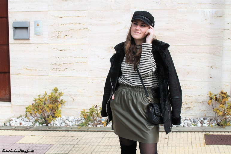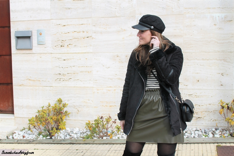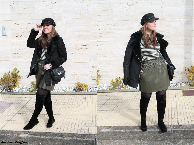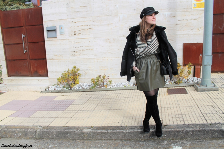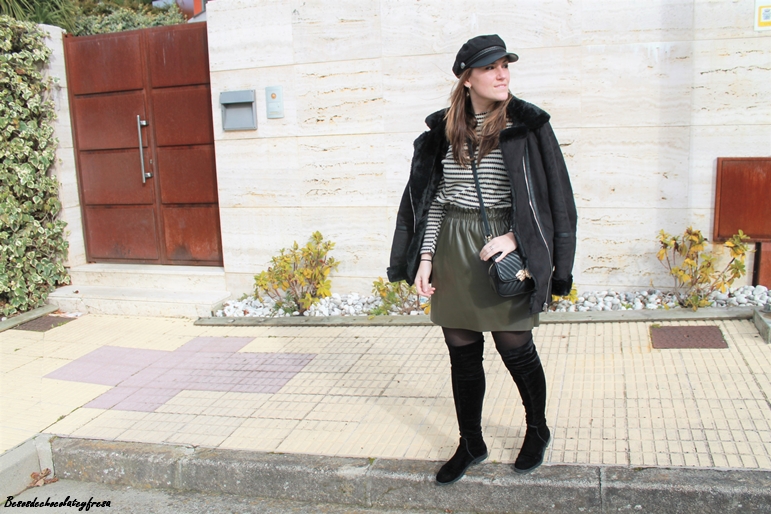 En este caso llevo falda polipiel en verde kaki con bolsillos y frunce en la cintura super estilosa y cómoda de llevar con sweater de cuello tortuga con rayas haciendo unas leves onditas. Botas over the knee y por encima abrigo/cazadora aviador en antelina y peluche negro.