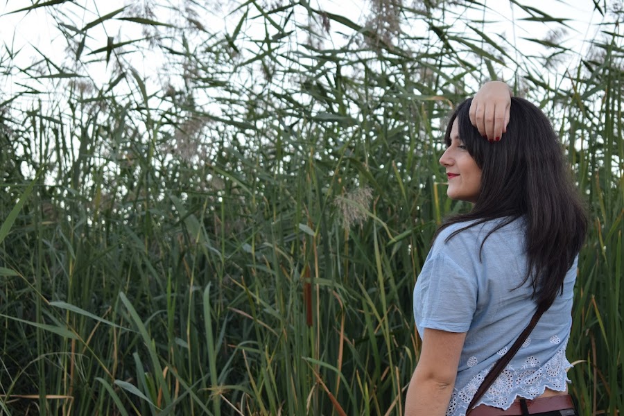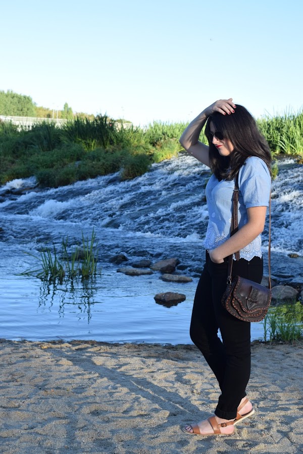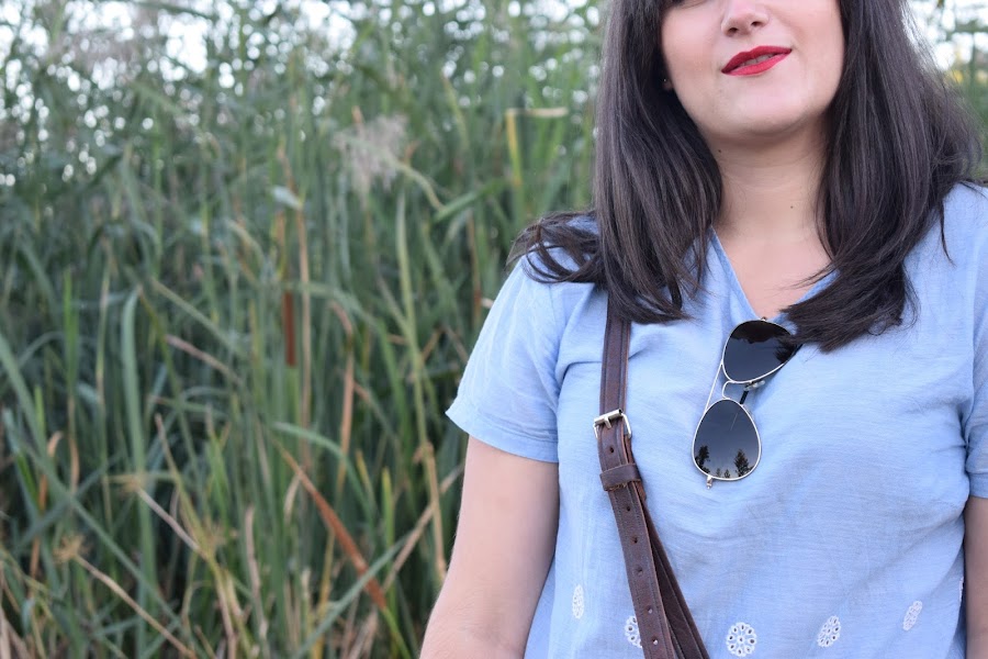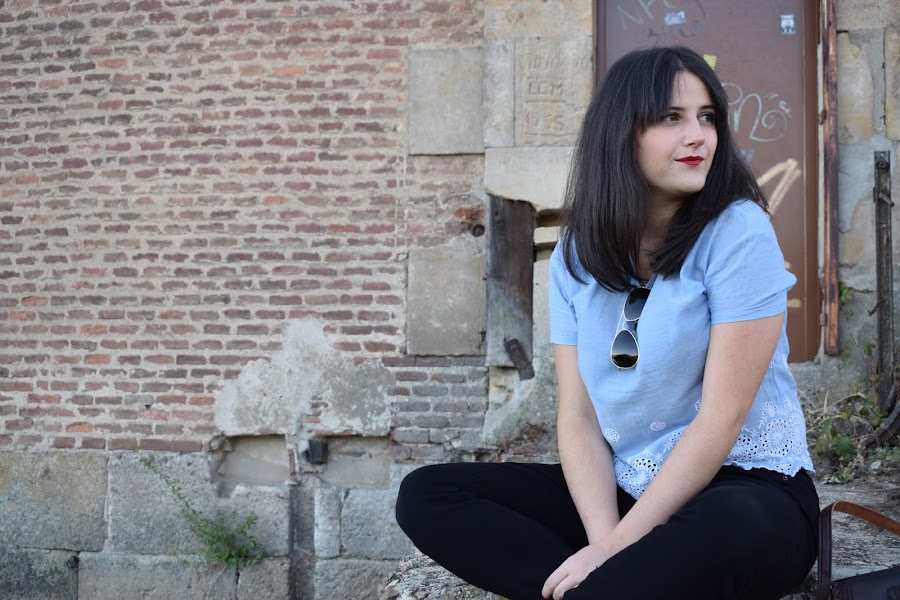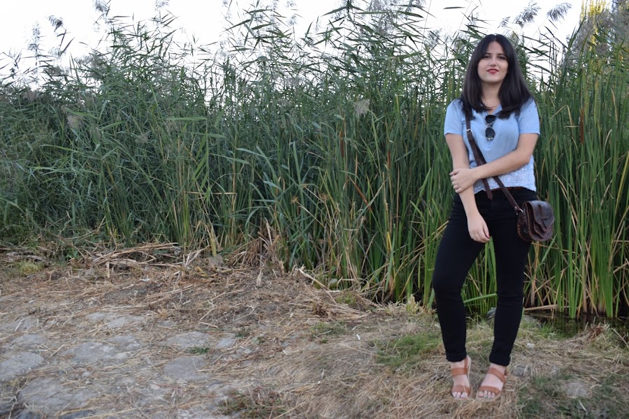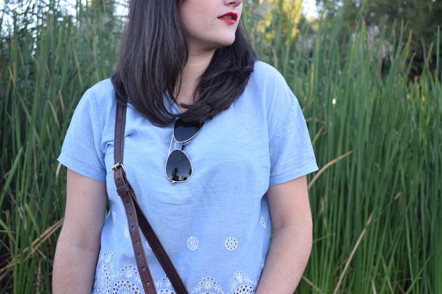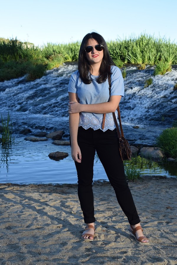 En cuanto a la camiseta es un poco más corta de lo normal, me la compré esta primavera porque este azul cielo me tenía obsesionada. Bueno, me sigue teniendo obsesionada la verdad. Los detalles que tiene en la parte de abajo me gustan mucho.