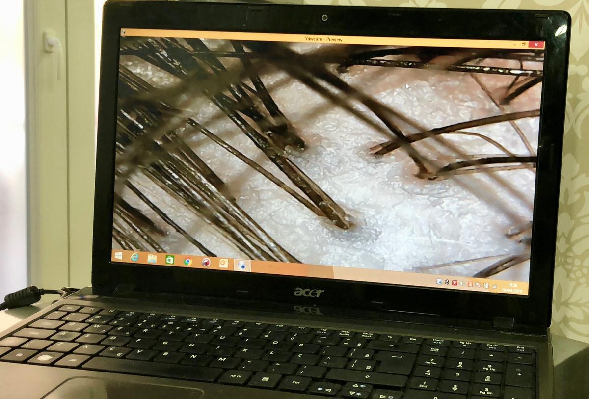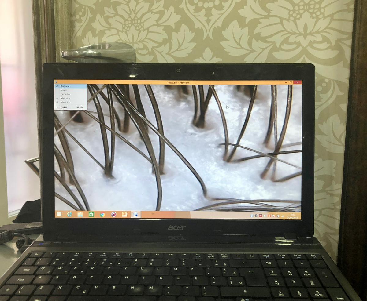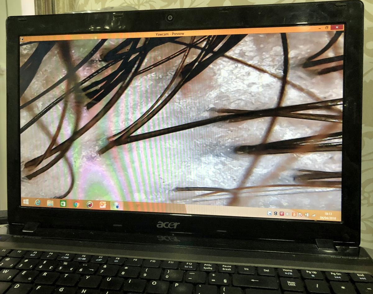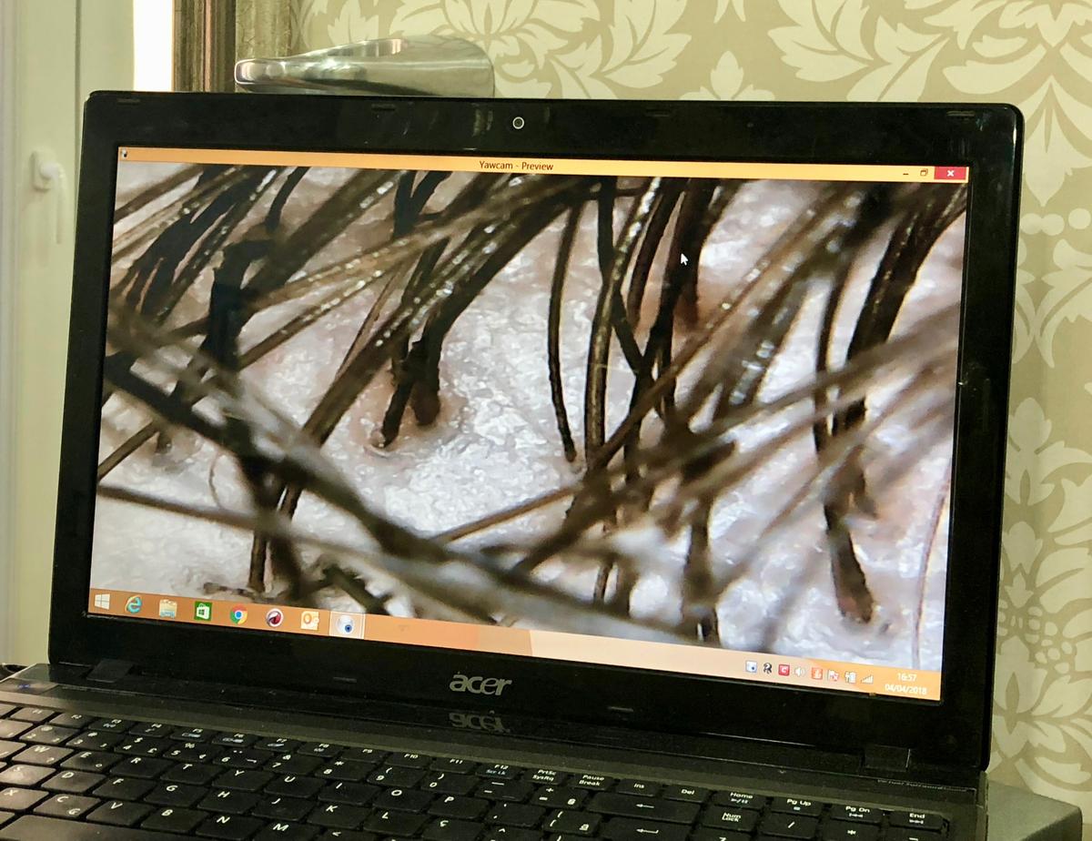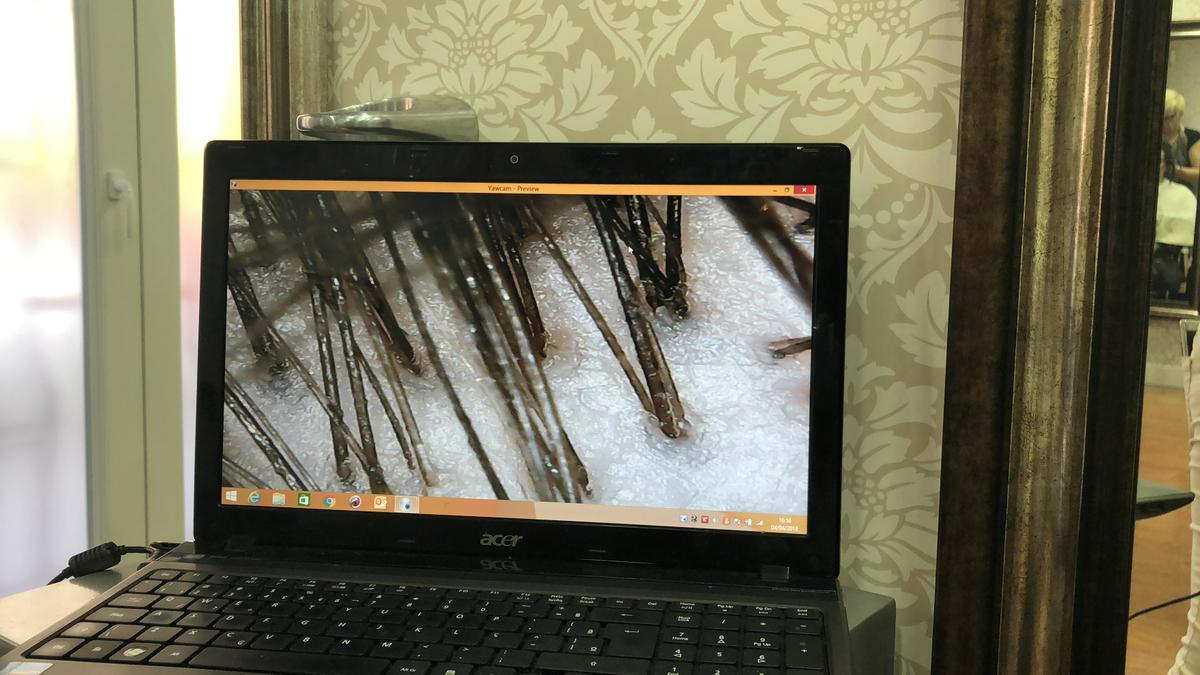 Valeria Costa con micro-cámara en mano nos enseño muy detalladamente los entresijos de nuestro cuero cabelludo antes de comenzar el tratamiento.