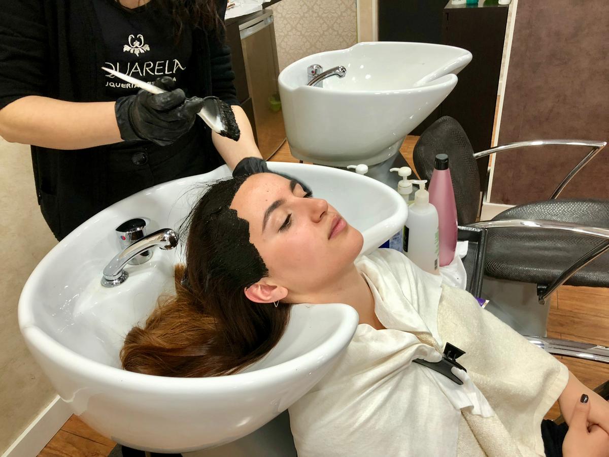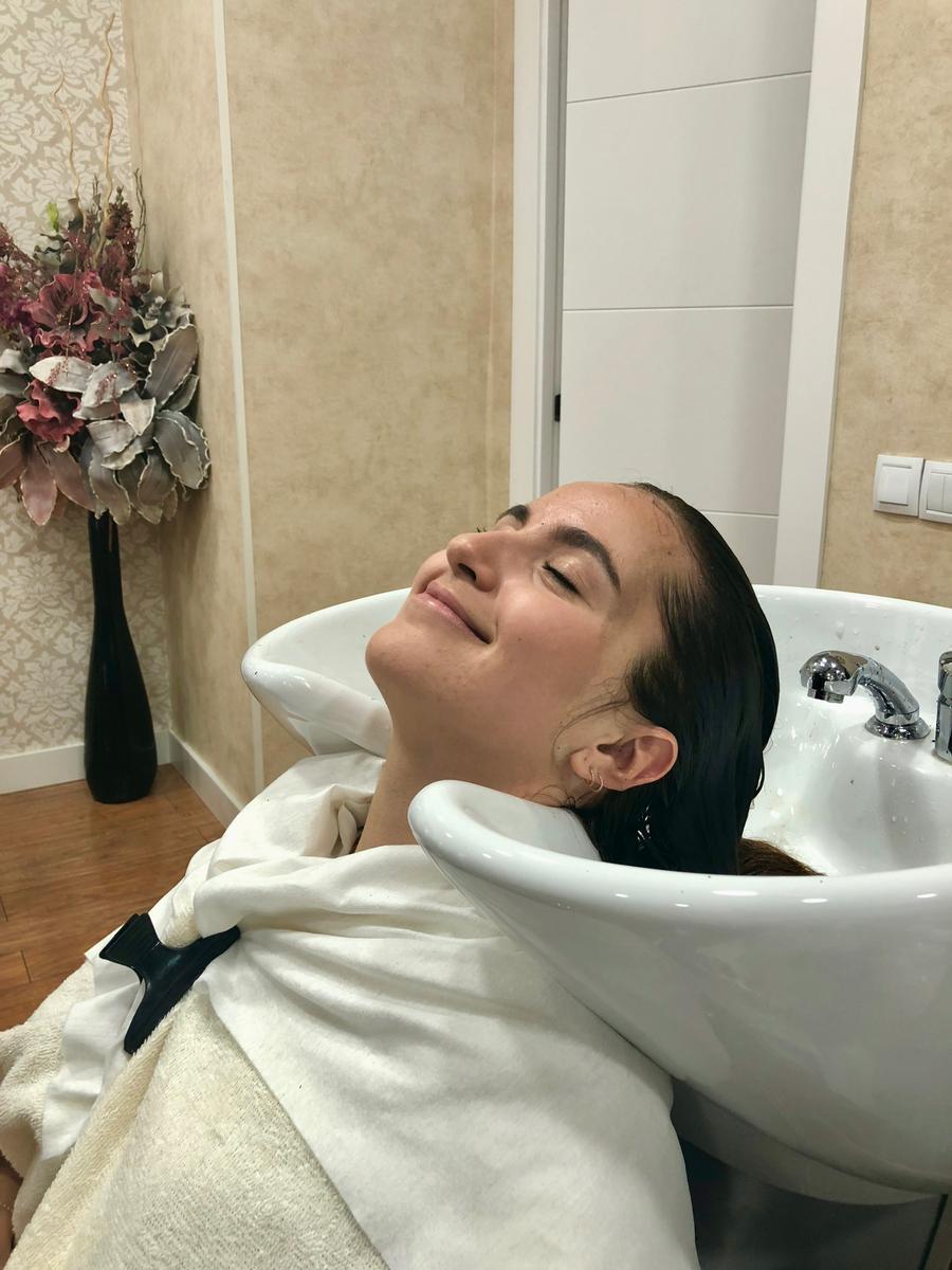 Con ayuda de un champú exfoliante con partículas muy finas nos realizaron un pequeño lifting capilar así a su vez les ayudaba a arrastrar la turba de medios a puntas.