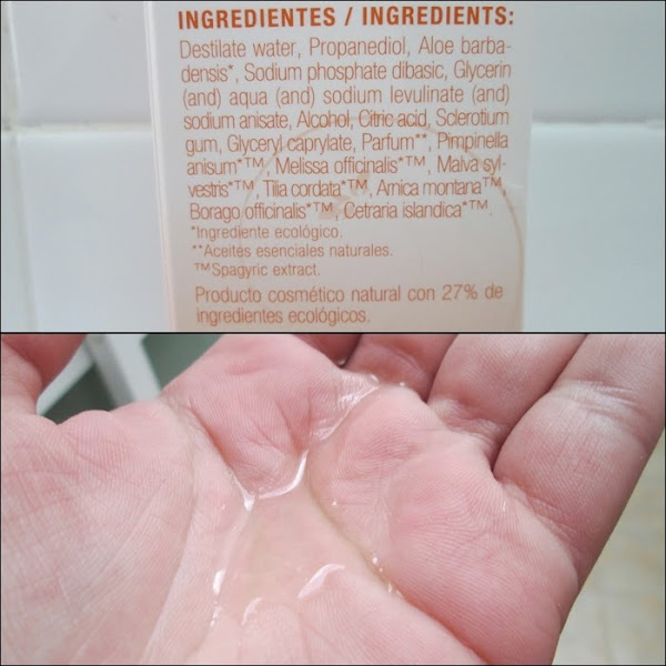 Como podéis ver en la foto, su textura es totalmente líquida, con un pequeño toque de color marroncito, aunque no se aprecia muy bien en la foto... Su olor, me ha gustado mucho, es muy herbal y agradable.