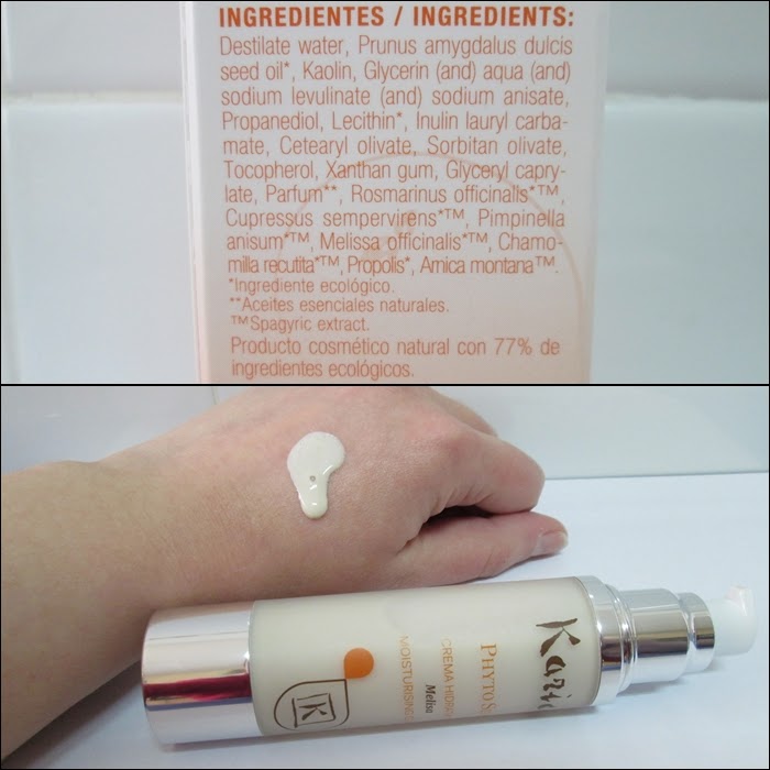 Esta crema facial, al igual que la pruina facial, está indicada para pieles mixtas. Cómo podéis ver, su textura es de color blanco roto y muy muy fluida. Se extiende y se absorbe muy muy bien. Dejando la piel hidratada durante todo el día.