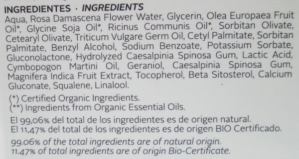 Su aroma, sin dudarlo, ¡me ha conquistado!. Es un olorcito, un tanto floral y dulzón, a la vez, gracias a que es rica en aceite de germen de trigo y de palmarosa, extracto de mango, vitamina E, aceite esenciales, oligosacáridos vegetales, aceite de soja, aceite de oliva virgen extra, aceite de ricino, escualeno vegetal, entre otros. Y, gracias a la combinación de estos maravillosos ingredientes, conseguimos tener un aspecto muy bonito en la piel, especialmente, la deja con elasticidad y firmeza.