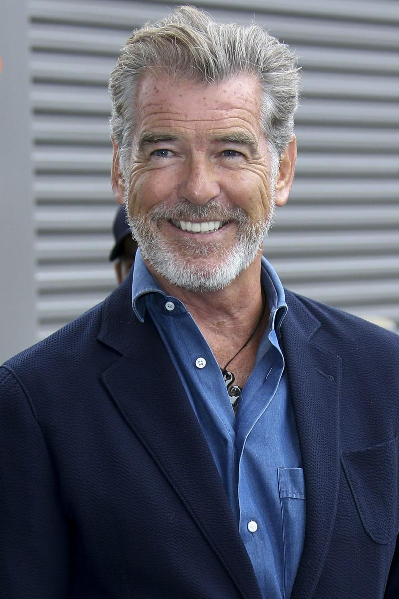 El actor suele llevar un look clásico que peina con una raya lateral. El cabello está recortado con tijeras sin hacer transiciones muy bruscas. La parte superior la deja algo más larga que el resto.Pierce Brosnan