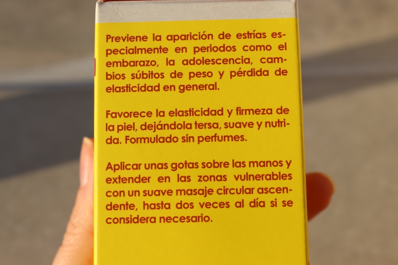 El aceite es de color amarillo suave y se desliza muy bien por las zonas a tratar, dejando la piel muy hidratada pero nada pegajosa ni grasa, ya que se absorbe rápidamente en la piel y la deja muy suave y confortable.