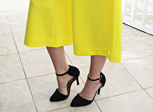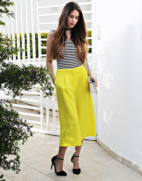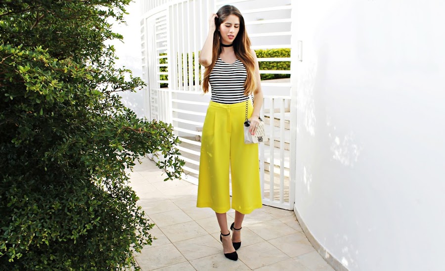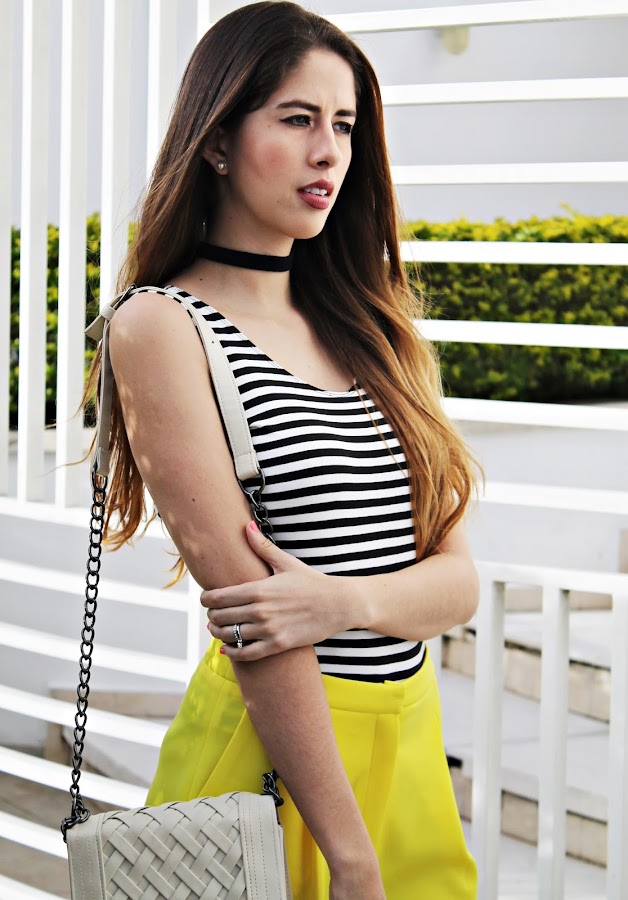 Esta un poco inspirado en un look de una de mis favoritas @caromng estoy usando un culotte amarillo de una de mis amigas y sinceramente me parece precioso y mega elegante, con un body de rayas, la misma cartera del look pasado (tengo una obsesión lo se jajajajaja) y unos zapatos negros de punta.