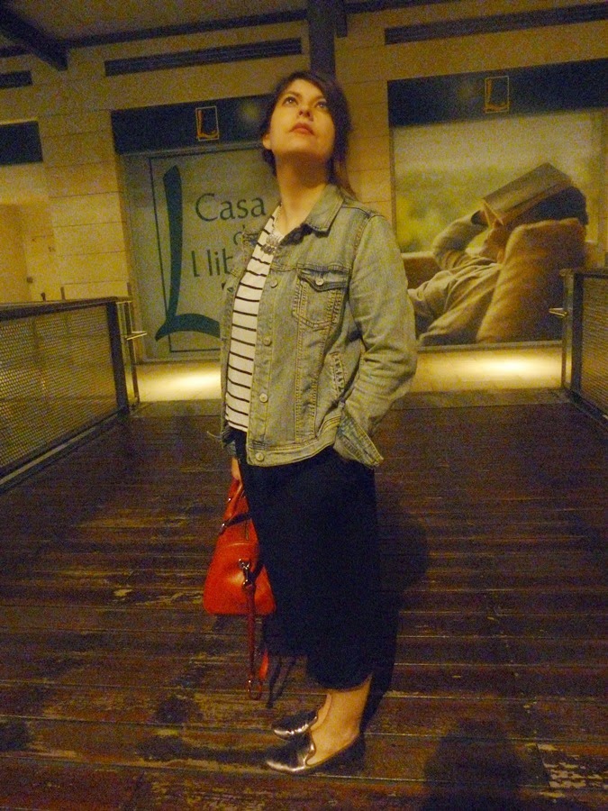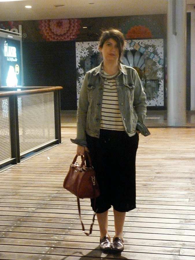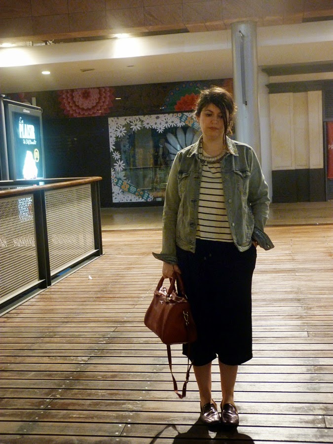 Hoy os traigo por fin un look propio, las fotos son tomadas por la noche en el Ctro. Cial La Maquinista, pasamos una tarde de shopping, cenamos y aprovechamos para hacer unas fotos, un tanto diferentes a las habituales por la luz, en cuanto el look, por fin me decidí a sacar una prenda que me compré en rebajas y que no había tenido ocasión de enseñar por aquí, el culotte, unos pantalones que me parecen muy estilosos y originales para poder usar tanto tacón o planos siempre y cuando seáis más bien altas, ya que su corte de pernera ancha y de longitud midi puede llegar a parecer que acorta la pierna, en ésta ocasión lo combiné con sleepers plateados, camiseta navy, cazadora denim, y pelo recogido en trenzas, ¿que os parece el outfit de hoy? :)