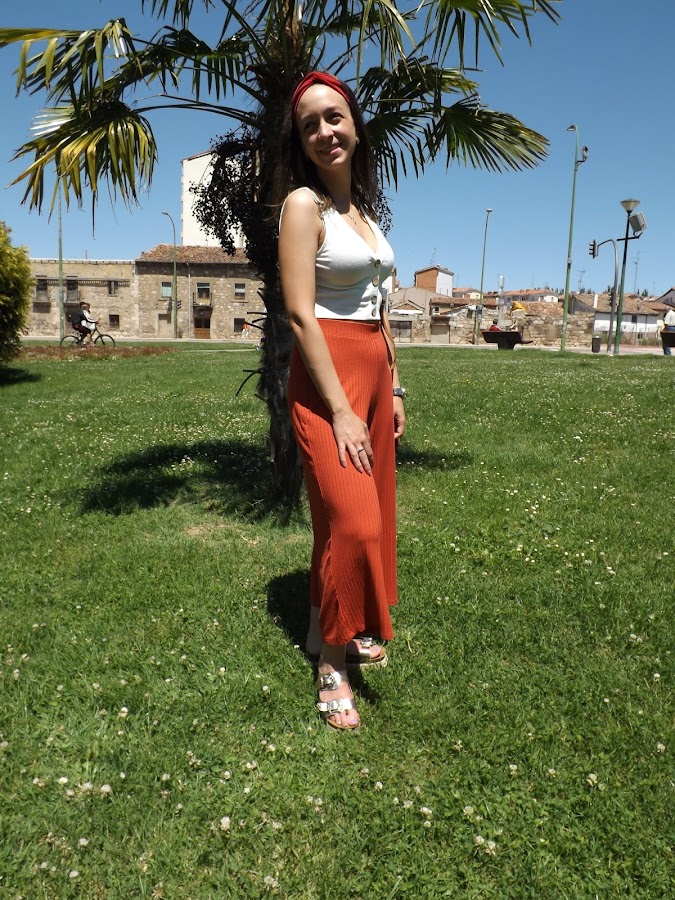 El color del pantalón es ideal porque se puede combinar con un montón de colores: negro, mostaza, blanco, crudo... Tengo pensadas un montón de combinaciones con él.