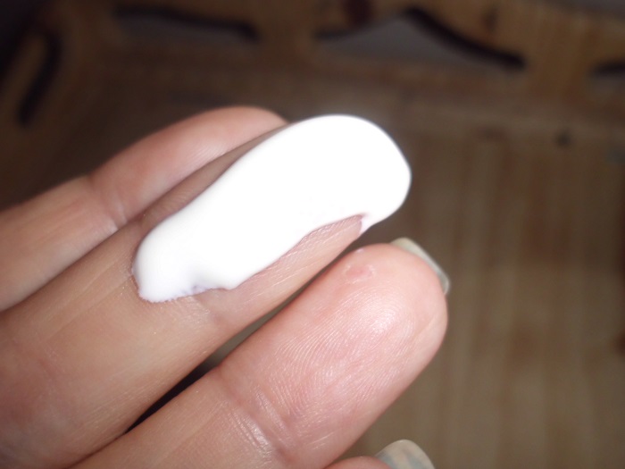 Crema lechosa y espesa de olor pronunciado, es más bien tipo pomada. No hay ninguna dificultad en repartirla a pesar de lo espesa que es, se absorbe en seguida.