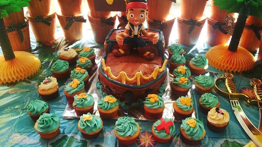 Pastel y cupcakes para fiesta de "Jake y los piratas del Nunca Jamás".