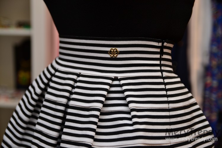 En esta ocasión, Adela Arias (al frente del establecimiento) y yo, quisimos crear dos looks sexys y veraniegos, pero elegantes a la vez, así que, en primera instancia, para primera hora de la tarde, optamos por combinar 2 piezas. De un lado, un body negro elástico que nos pareció la prenda más sexy y femenina de la colección al ceñirse completamente a la figura y que destacaría por su cuello asimétrico con gran lazada en el hombro izquierdo y del otro, una falda de gomas a rallas en blanco y negro con cinturilla ancha y pliegues que le proporcionan el volumen perfecto (fijáos en el detalle de la fornitura de Cuplé en color oro).