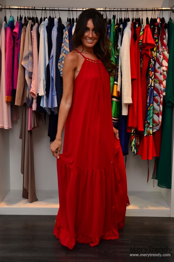 Y ya, para la tarde-noche, nos encantó este vestido largo en color rojo de tirantes finos con detalles dorados en el escote, aportando luz en el cuello gracias a las perlas plateadas entrelazadas. En un principio pensamos que tal vez quedaría mejor con un cinturón de latón en oro...
