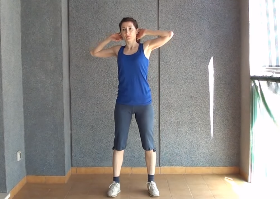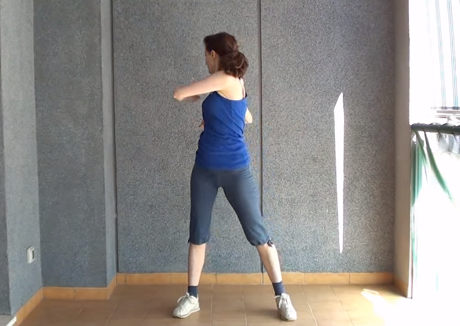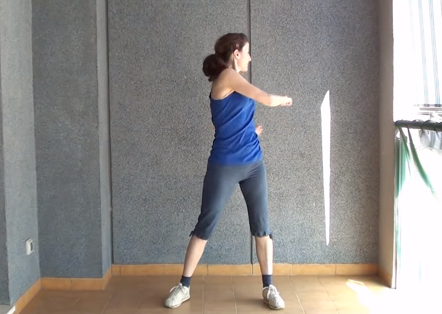 ¡Cambiamos la dirección de movimiento! Las pies siguen sin levantarse del suelo y la cadera bloqueada. Ahora tenemos que girar la cintura de forma que intentemos mirar la pared que está a nuestra a espalda. Nos ayudamos con los brazos y giramos de una lado a otro. Hay que repetirlo 10 veces a cada lado.