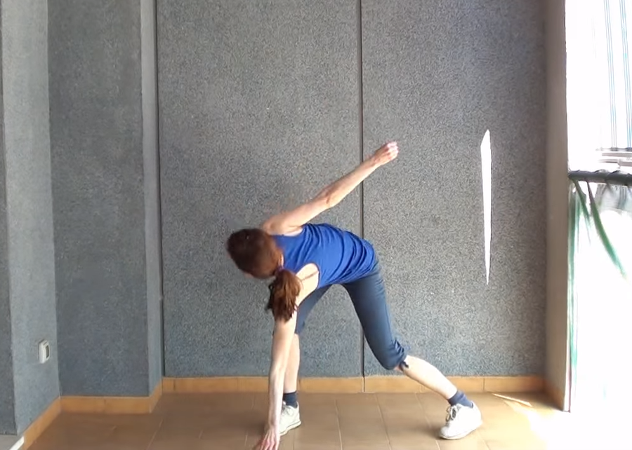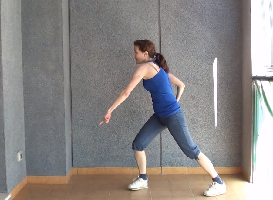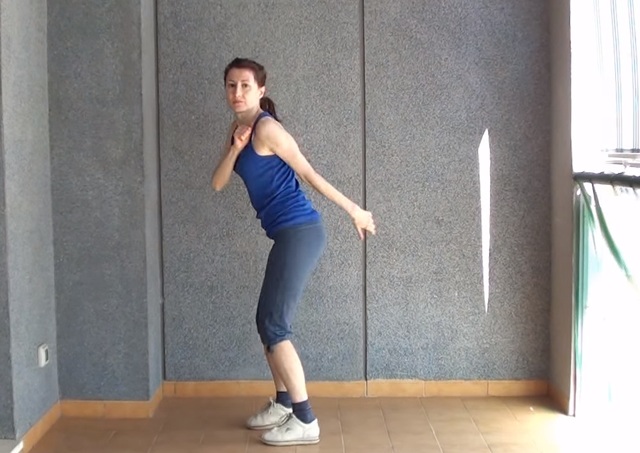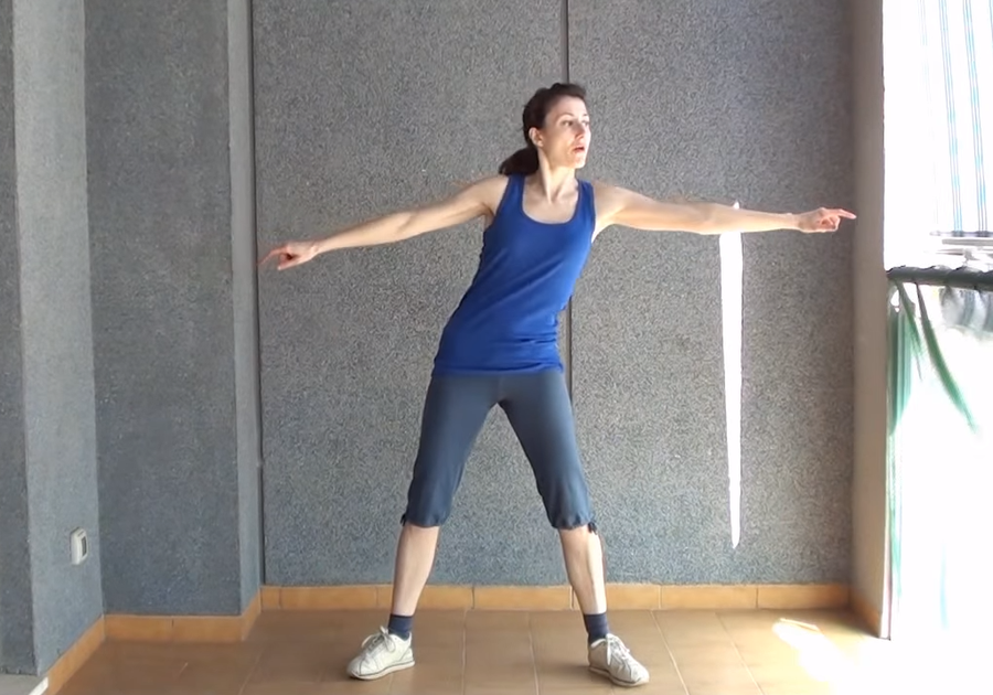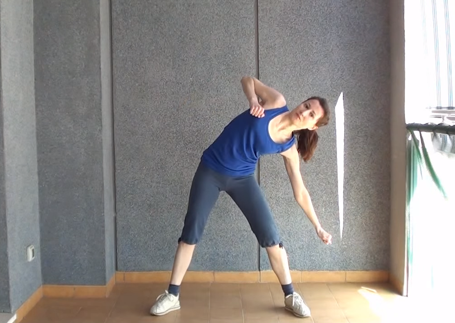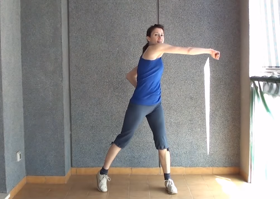 Empezamos con las piernas abiertas ligeramente más que la anchura de los hombros, dejamos la cadera fija y lo único que tenemos que mover es la cintura de un lado a otro. Con los brazo estirados, intentamos tocar la pared de una lado y luego la del otro. Repetimos el movimiento 10 veces a cada lado despacio y luego 10 veces más rápido. Así empezamos a calentar.