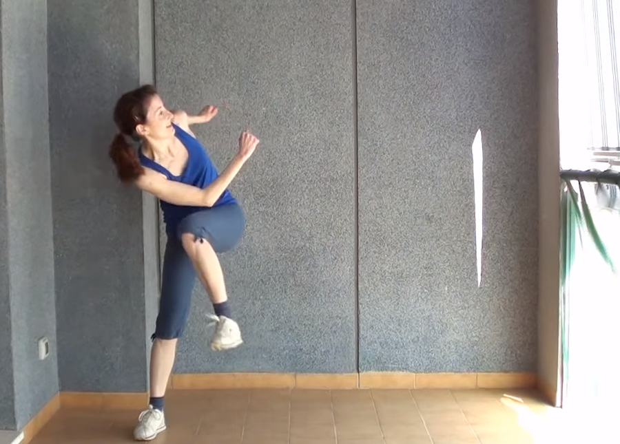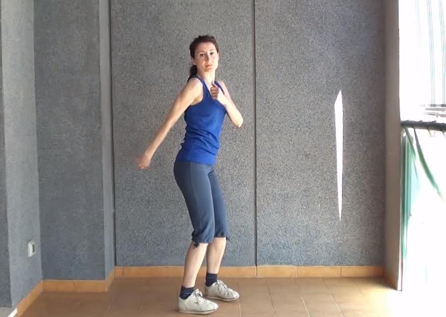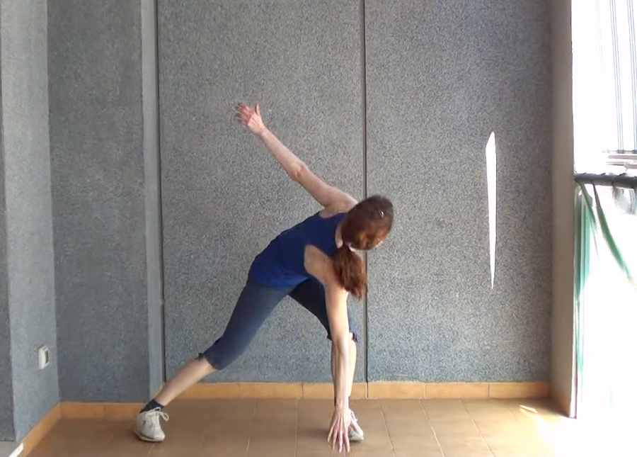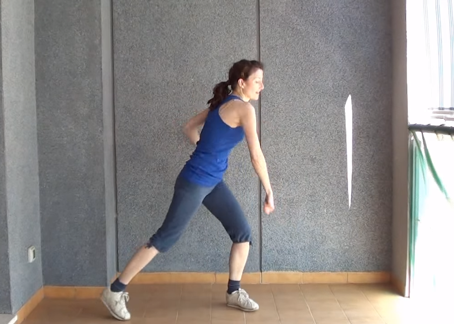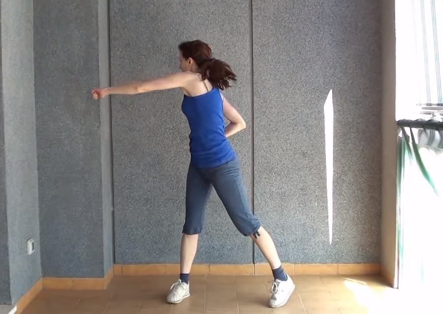 Empezamos con las piernas abiertas ligeramente más que la anchura de los hombros, dejamos la cadera fija y lo único que tenemos que mover es la cintura de un lado a otro. Con los brazo estirados, intentamos tocar la pared de una lado y luego la del otro. Repetimos el movimiento 10 veces a cada lado despacio y luego 10 veces más rápido. Así empezamos a calentar.