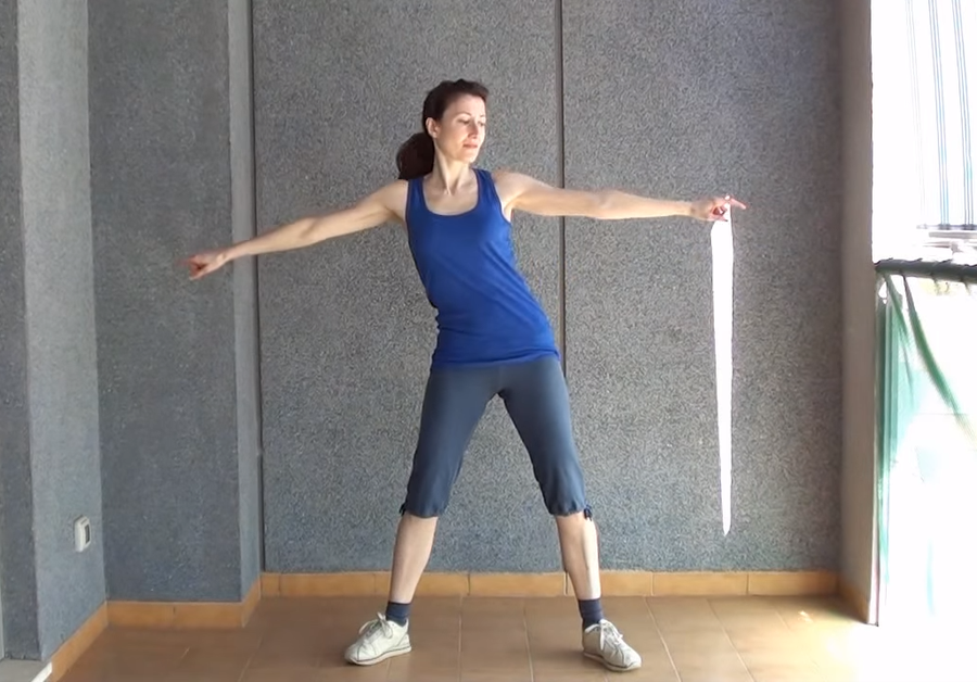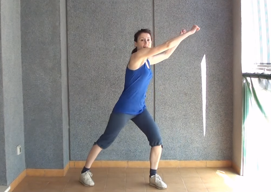 Abrimos bastante las piernas y juntamos los puños con los codos estirados a la altura del pecho. Cuando doblamos la cintura a la derecha, estiramos ese brazo. Hacemos lo mismo a la izquierda. ¡!0 repeticiones con cada brazo!
