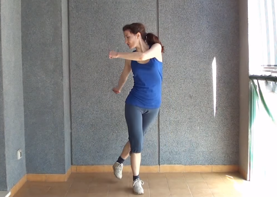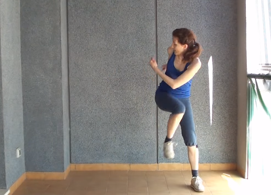 Este movimiento es más complejo, ¡atenta! Lleva la rodilla derecha a tocarse con el codo izquierdo. Te desplazas al otro lado con dos salto y haces el movimiento al revés, rodilla izquierda y codo derecho. ¡10 veces!