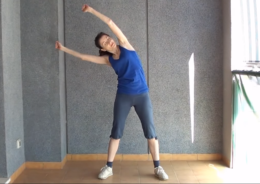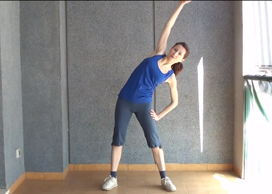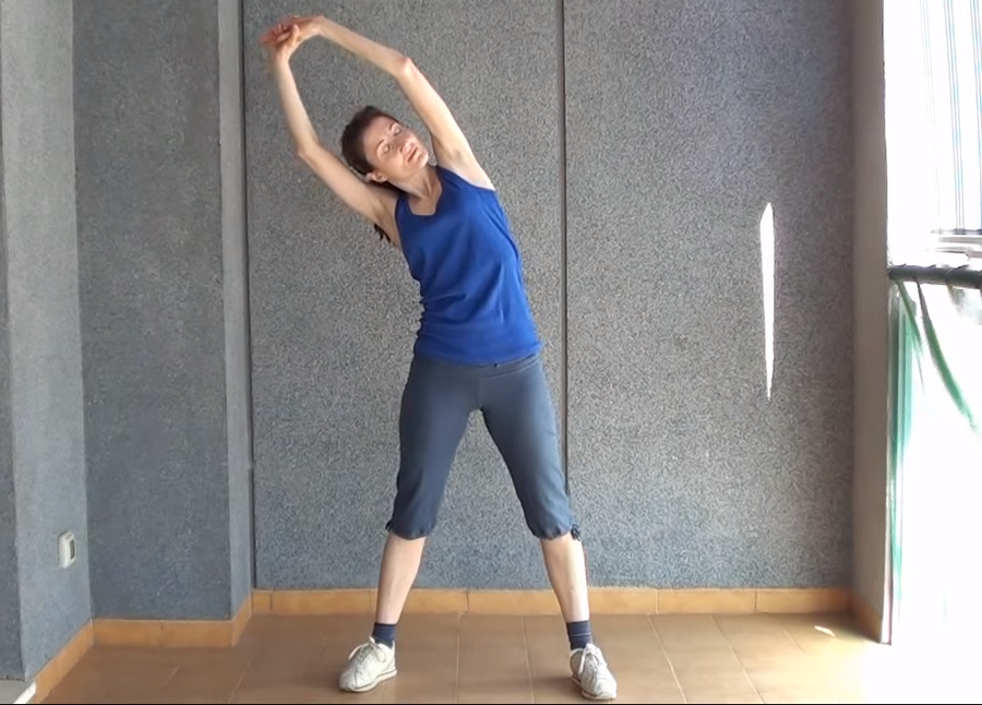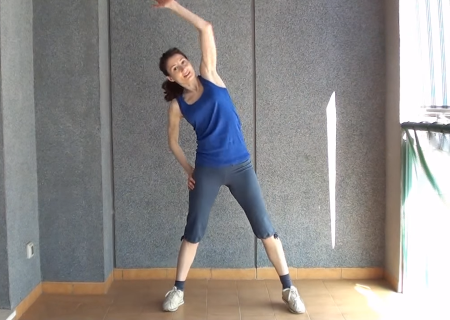 Se terminó lo duro y este último ejercicio es para estirar. Abre las piernas, respira hondo y estira tu cintura llevando los brazos lo más alto que puedas hacía un lado. Aguanta en esa posición unos segundos y luego lo hacer hacia el otro.