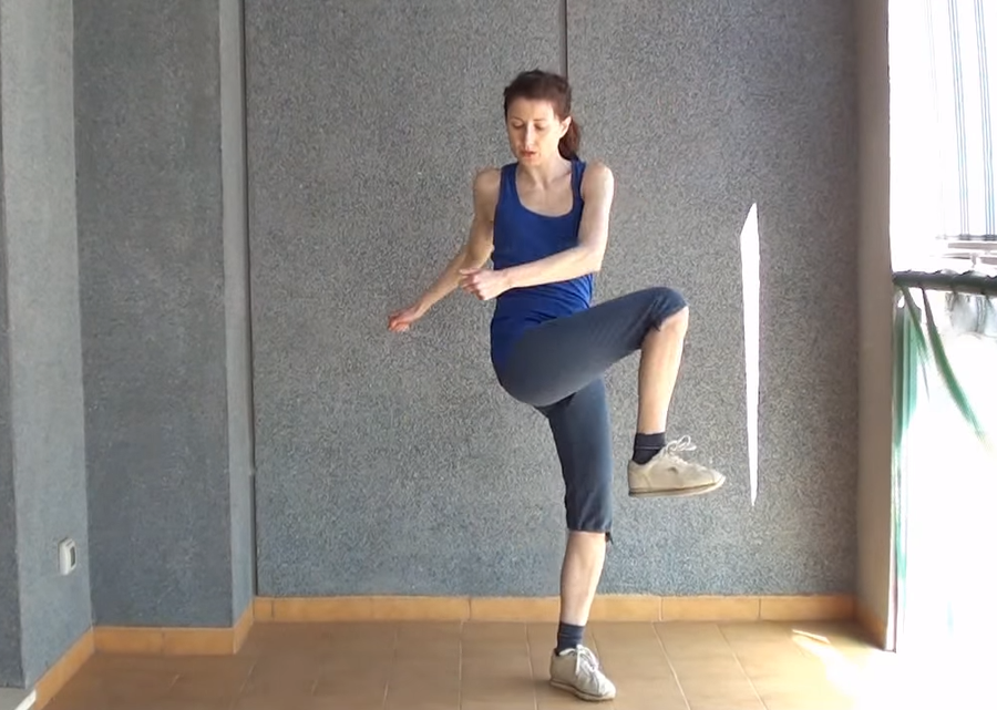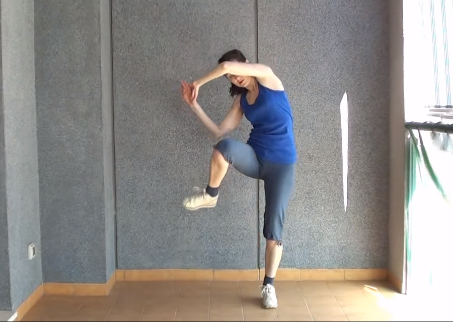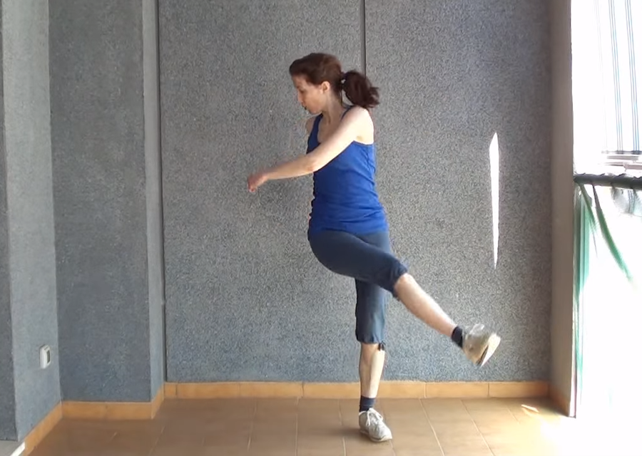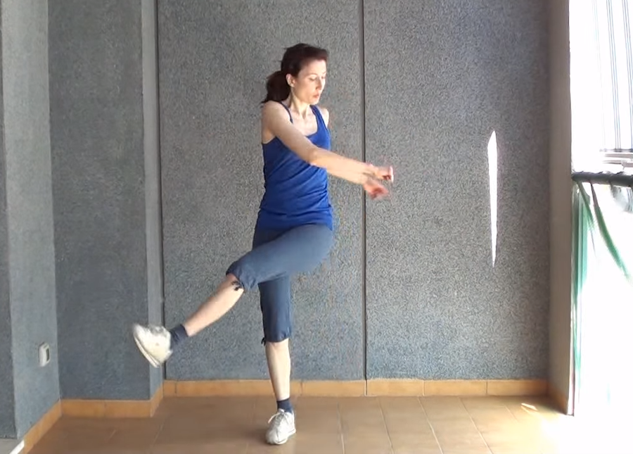 Comenzamos con una pierna delante flexionada y otra detrás estirada y los brazos levantados. Subimos la pierna estirada a la vez que llevamos los brazos hacia ese lado. Hay que hacer 10 con la derecha y 10 con la izquierda.