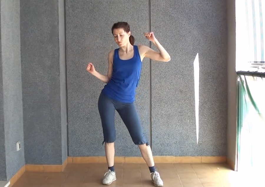 Llegó el momento de mover cadera. Seguimos sin mover los pies. Elevamos las manos a la altura de la cara y sacamos cadera hacia un lado y hacia otro. Tienes que hacerlo 10 veces. ¡Es como si estuvieses bailando!