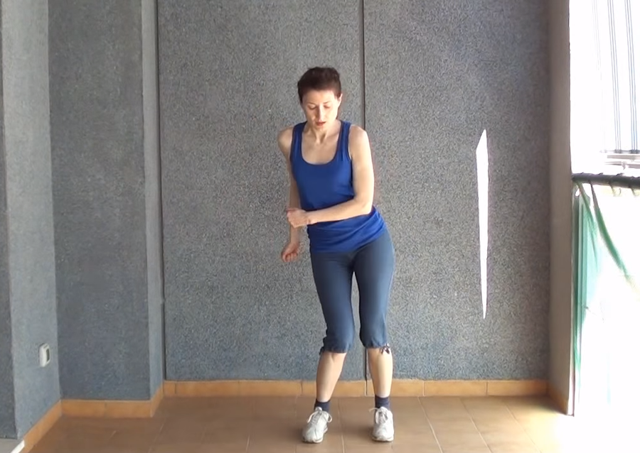 Empezamos a movernos más y toca saltar de un lado a otro con los pies juntos. Cada vez que vayas a un lado, sacas la cadera hacia esa dirección. Hay que saltar 20 veces, 10 a cada lado.