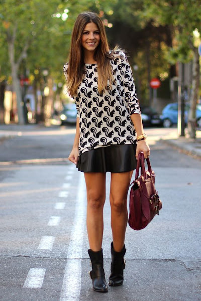 -Si estás decidida a llevar taconcitos, opta por los más sencillos posible, estilo stilettos negros, o botines con tacón, siempre teniendo cuidado de no ir demasiado destapada por arriba y asi dar total protagonismo a nuestra faldita mini. Una buena idea es llevar una blusa básica o camiseta con chaqueta oversize.