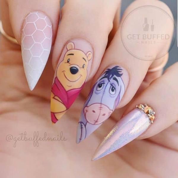 Clávate las uñas en el Bosque de los Cien Acres con estos puntas de punta de bailarina inspirados en Winnie the Pooh. En un dedo, tienes la cara del oso amarillo favorito de todos. En el otro, tienes el deprimido pero adorable burro, Eeyore. Por supuesto, los acentos de panal hacen que este aspecto juguetón sea aún más dulce. Aunque nos hubiera gustado ver un meñique recubierto de Piglet en la mezcla, este aspecto necesita poca mejora.