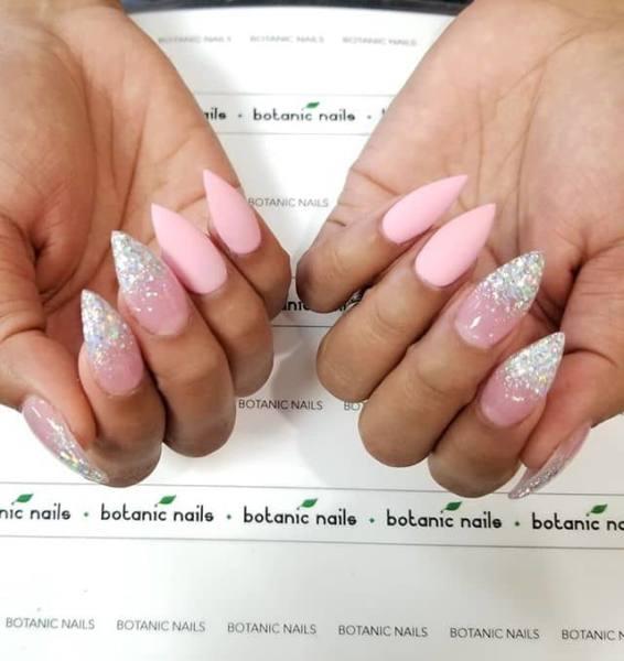 Deja que tu muñeca interior brille con estas encantadoras uñas de tacón de color rosa pastel. Son súper lindas y sexy al mismo tiempo. Nos encanta que algunas de las uñas sean lechosas mientras que otras parecen tener una base clara. Tampoco podemos resistir la ocasional punta brillante.