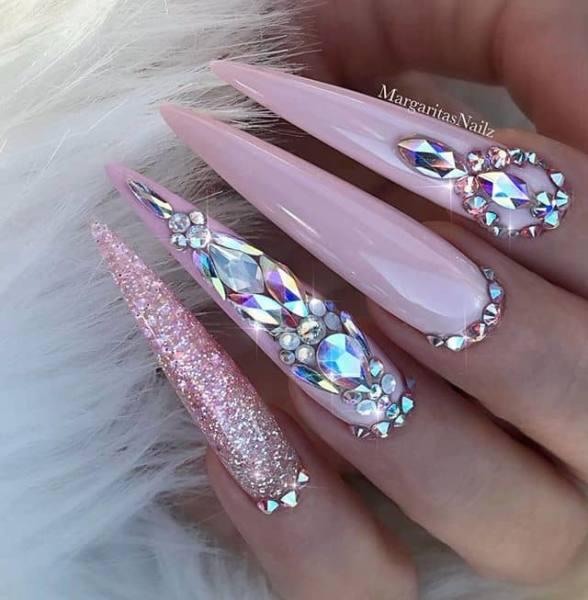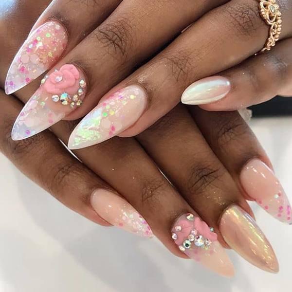 No hace falta decir que las uñas puntiagudas no son para los mansos, Tal vez eso es lo que hace que este diseño femenino se destaque. El aspecto es de color rosa pálido, con brillo, flores y strass. Mientras que las puntas afiladas de estas uñas envían un mensaje, el arreglo inspirado en un cuento de hadas envía otro.