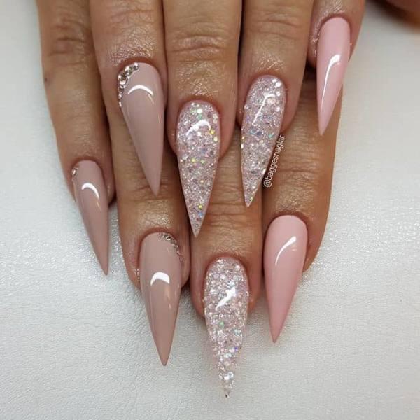 Si quieres mostrar tu lado femenino, los diseños de uñas de estilete feroces y femeninos como este son una gran manera de hacerlo. Nos encanta que no tengas que ceñirte a un solo color o brillo. Este conjunto tiene meñiques rosados desnudos y pulgares. Mientras tanto, también incluye anillos de oro rosa brillante y punteros y dedos medios de color rosa brillante. Toda la mezcla hará que tus dedos se vean más bonitos que un centavo. Sin mencionar que obtienes puntos extra por estar de moda.