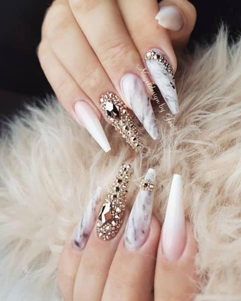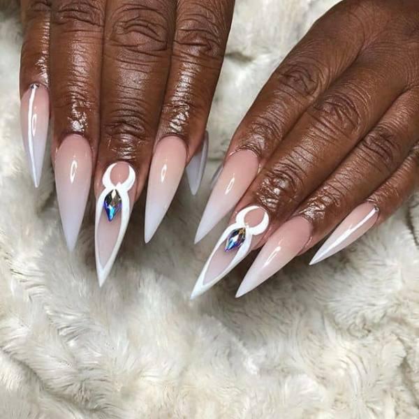 No nos cansamos de estos simples puntas blancos de estilete. De hecho, son una gran elección para una soltera que busca mostrar su lado salvaje. Un poco de hielo hace un largo camino para complementar estas uñas pulidas. De hecho, no podríamos estar más satisfechos con la pendiente decorativa de los estrases que recubren las cutículas.