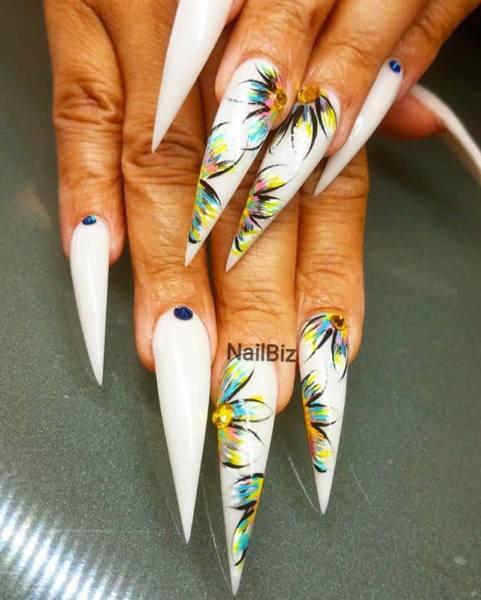 Estos puntas de estilete seusical tienen una capa de base blanca bastante básica. Sin embargo, las caprichosas flores pintadas añaden un poco de dinamismo artístico. Mientras tanto, los diamantes de imitación azules y dorados ayudan a vestir el diseño. Si estás buscando un diseño de uñas único, este podría servir de inspiración.