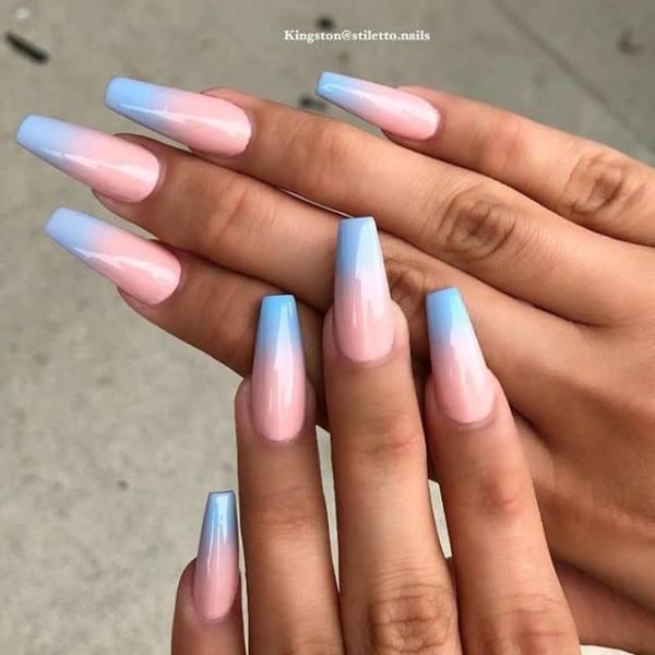 En caso de que hayas estado viviendo bajo una roca durante los últimos cinco años, Ombré está dentro. Nos encanta la poco convencional combinación de azul bebé y rosa en este impresionante diseño de uñas de aguja. Este look es tan dulce como el algodón de azúcar. Incluso las puntas ligeramente limadas te lo dirán.
