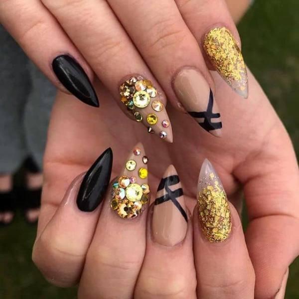 Estas feroces uñas negras representan la verdadera naturaleza de la moda del estilete. Se trata de ser audaz, llamativo y sensual. Las puntas afiladas y cónicas de estas uñas de tinta parecen peligrosas al tacto. Mientras tanto, están envueltas en cadenas y tienen tacos romos. De hecho, este aspecto saca a relucir los cincuenta tonos de gris que hay en nosotros.