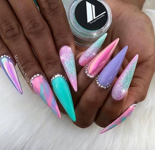 Si vas a clavar puntas puntiagudos como dagas, ¿por qué no a lo grande? Este look cuenta con una variada colección de uñas rosadas y plateadas. Hay rosa metálico, rosa brillante, rosa y plata brillante ombré, y rosa y malva ombré. Sin mencionar que hay una uña texturizada inspirada en el cuerno de unicornio con un acabado blanco nacarado. ¿Mencionamos que también necesitarás un par de diamantes de imitación para completar este look?