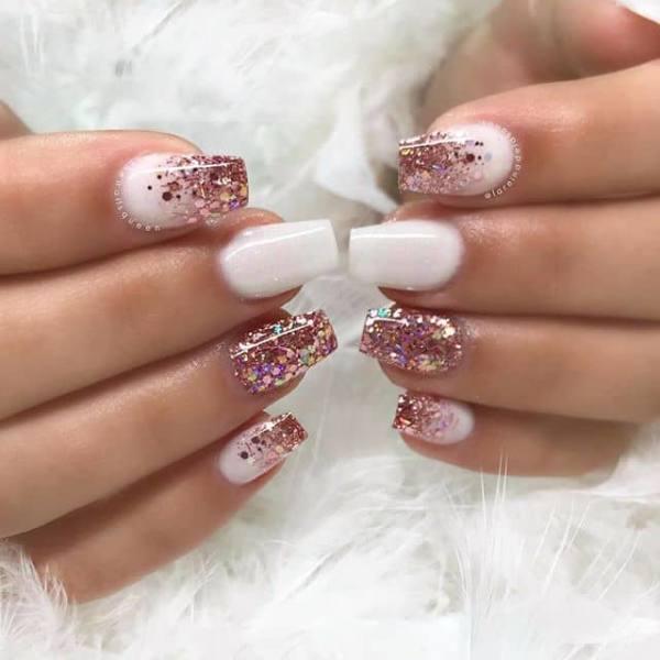 ¿Tu vestido de graduación es blanco? Mantén las cosas mínimas con esta hermosa manicura que tiene una base blanca con un toque de rosa alrededor de las cutículas. Dale un toque de sabor añadiendo un toque de brillo rosa en una uña de acento. Con el baile de graduación siendo una ocasión tan especial, agrega un poco de brillo a tus uñas para una combinación brillante.