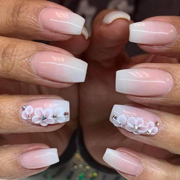 ¿Buscas una manicura femenina para el baile de graduación? Estas uñas blancas y rosadas se ven atemporales y sofisticadas con suaves flores femeninas sobre el esmalte blanco. Los tacos rosados en 3D son una hermosa adición que es tan brillante y glamorosa, que es perfecta para el baile de graduación. Los tacos y las gemas son los accesorios perfectos que añadirán estilo a cualquier manicura.