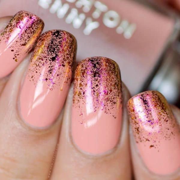 Las uñas iridiscentes tienen un aspecto propio. La idea de las uñas iridiscentes es que tienen un color que cambia con diferentes ángulos. Si tu vestido tiene un toque de coral, esta impresionante manicura sería la mejor opción para la noche del baile. Esta manicura tiene puntas que cambian de color y que se ven anaranjadas, moradas, rosadas y negras cuando se ven desde diferentes ángulos.