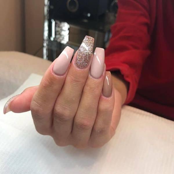 Esta hermosa y brillante manicura tiene un toque de oro en la base sobre un pulido beige claro natural. Me encanta esta combinación de pulido claro y brillo dorado. Es tan sutil, pero elegante para cualquier ocasión especial. Esta encantadora manicura es una hermosa elección sin importar si tu estilo de baile es simple y tradicional o audaz y llamativo.